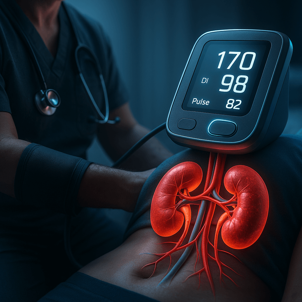 High blood pressure (hypertension) means the force of blood against your artery walls is too strong. Over time, this can damage your kidneys. At the same time, when kidneys are not working well, they can raise blood pressure — creating a dangerous cycle.